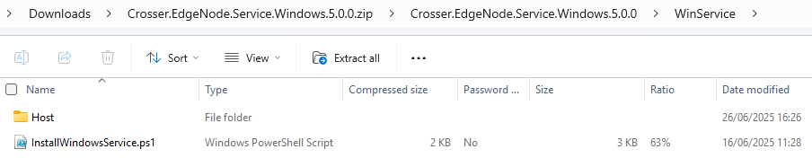 When extracting the downloaded archive, navigate to \Crosser.EdgeNode.Service.Windows.5.0.0\WinService, and extract the content to your desired destination, ie. C:\Crosser.