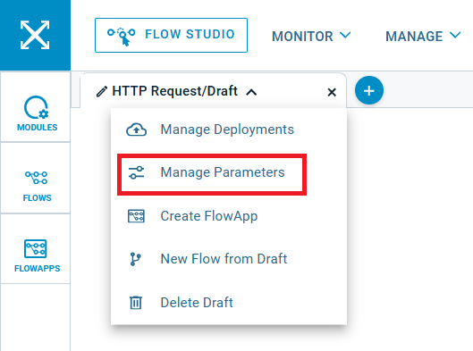 In the Flow Studio you should now see that there is at least one Parameter assigned to the 'HTTP Request' module indicated by the 'P' icon.