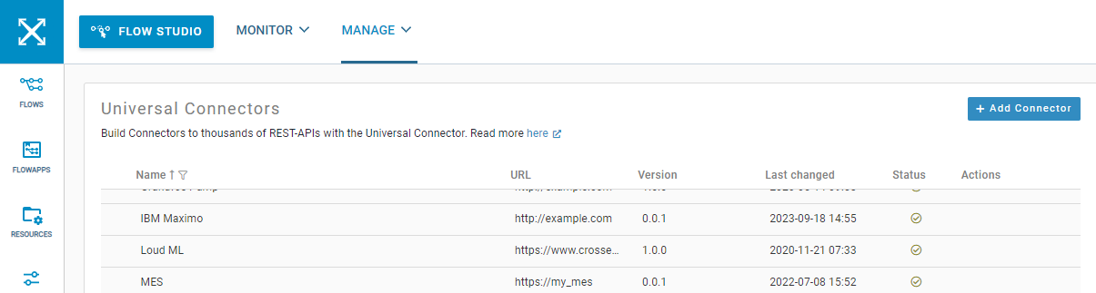 Universal Connectors are generic modules used to connect to REST APIs. Using the Universal Connector (UC) wizard you can build your own reusable modules to simplify getting or sending data from/to external APIs when building flows in the Flow Studio. A UC can use settings provided by the user or data from flow messages when building the API calls. You can also provide your own custom icon and documentation for UCs. Once published a UC will look just like any other module in the Flow Studio library. UCs also support versioning, so you can update the module over time and then select the version to use when configuring the module in the Flow Studio editor.